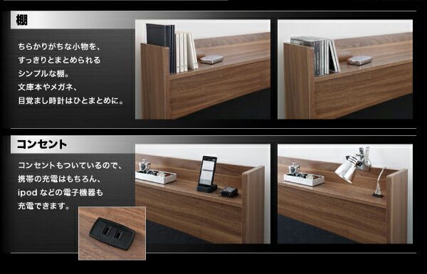 ウォルナット柄/棚・コンセント付き収納ベッド スタンダードボンネルコイルマットレス付き セミダブル
