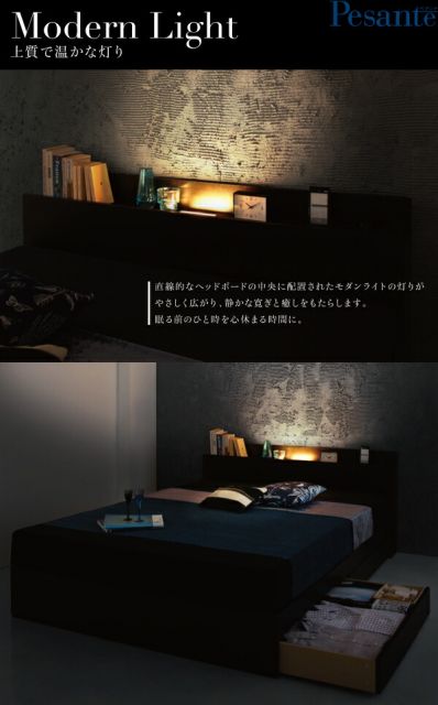 モダンライト・コンセント付き収納ベッド プレミアムボンネルコイルマットレス付き シングル
