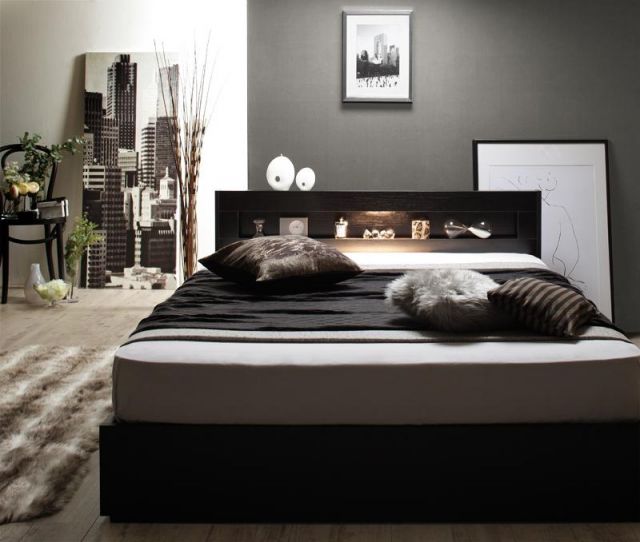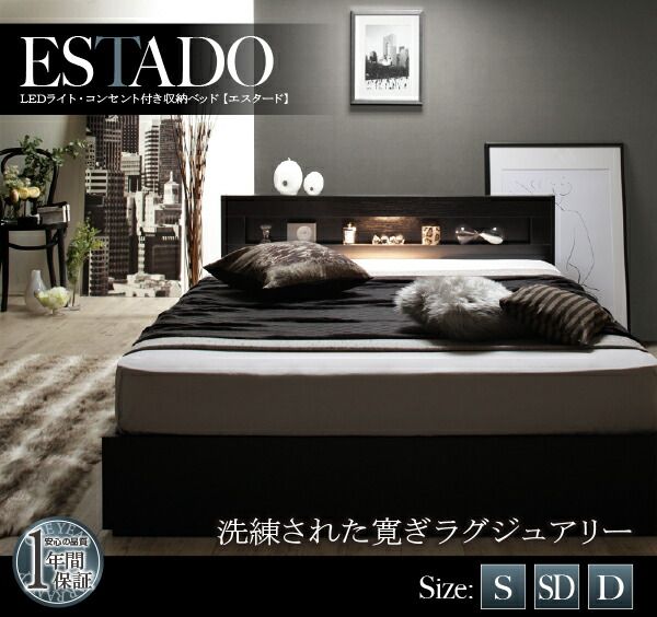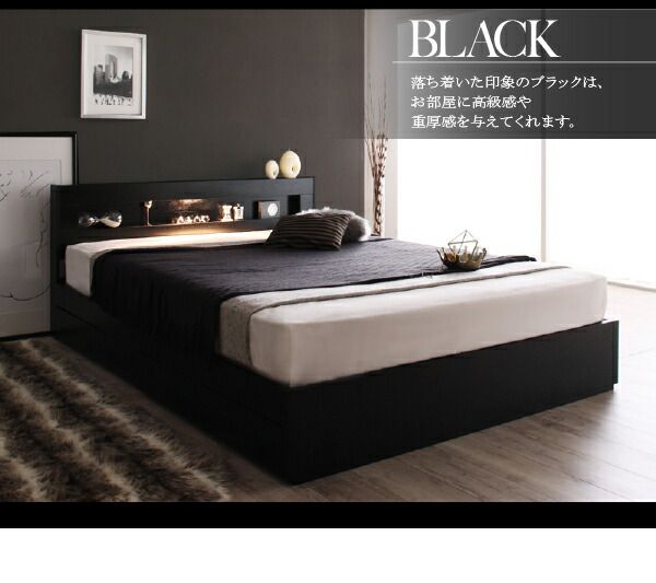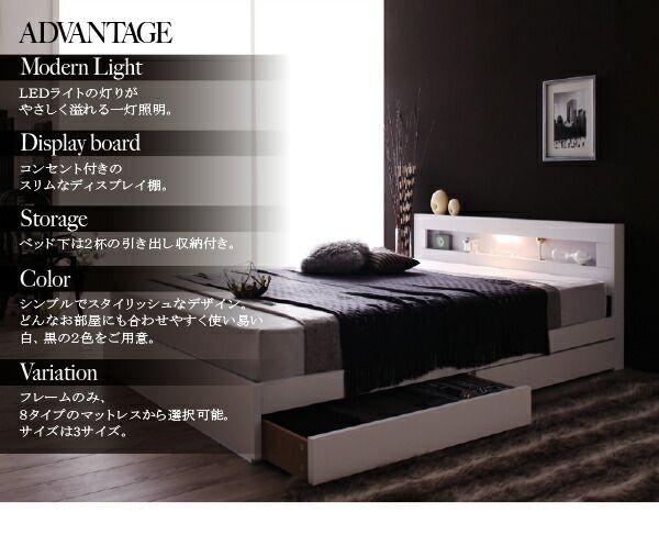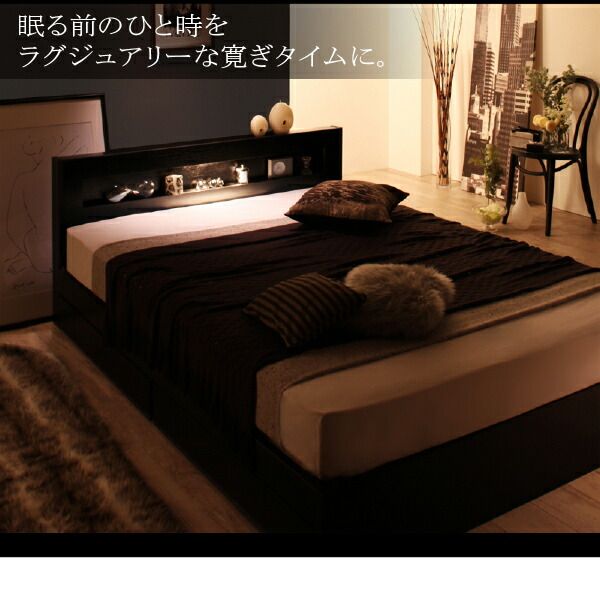 LEDライト・コンセント付き収納ベッド プレミアムボンネルコイル マットレス付き シングル