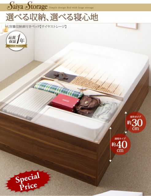 大容量収納庫付きベッド 薄型プレミアムボンネルコイルマットレス付き 深型 すのこ床板 シングル
