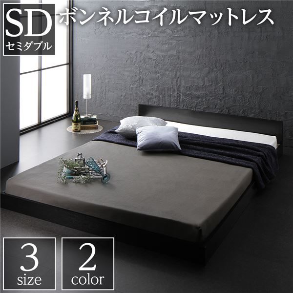 フラットヘッドボード ローベッド フロアベッド セミダブルサイズ (ボンネルコイルマットレス付き) スノコ構造 1枚板 頑丈 木目調 スタイリッシュ ブラック