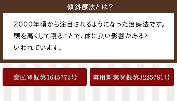傾斜療法をとりいれたマットレスです。傾斜療法とは、2000年頃から注目されるようになった治療法です。頭を高くして寝ることで、体に良い影響があるといわれています。