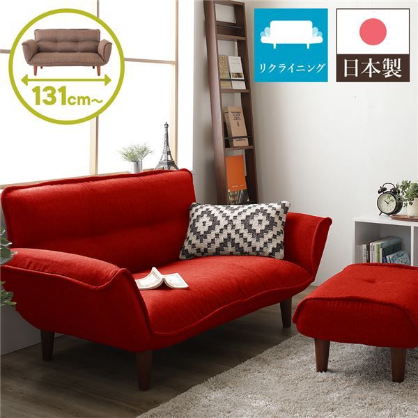 日本製 リクライニングソファー/カウチソファー 2人掛け オットマン付き ダリアン生地 レッド 脚部:ブラウン 幅131cm 脚付き 国産 ソファ ソファー ポケットコイル ローソファ 北欧 リビング ひとり暮らし 代引不可