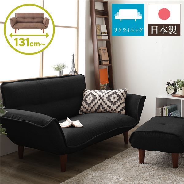 日本製 リクライニングソファー/カウチソファー 2人掛け オットマン付き ダリアン生地 ブラック 脚部:ブラウン 幅131cm 国産 ソファ ソファー おしゃれ ポケットコイル ローソファ 北欧 リビング ひとり暮らし 代引NG