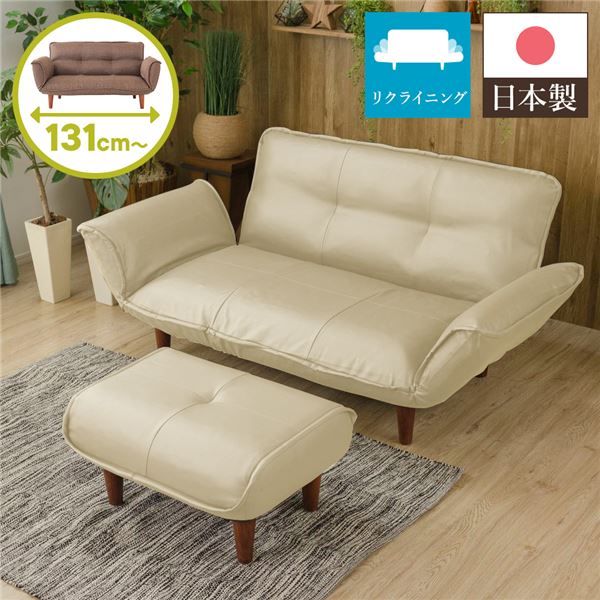 日本製 リクライニングソファー/カウチソファー 2人掛け オットマン付き PVC生地 アイボリー 脚部:ブラウン 幅131cm 脚付き 国産 ソファ ソファー おしゃれ ポケットコイル ローソファ 北欧 リビング ひとり暮らし 代引NG