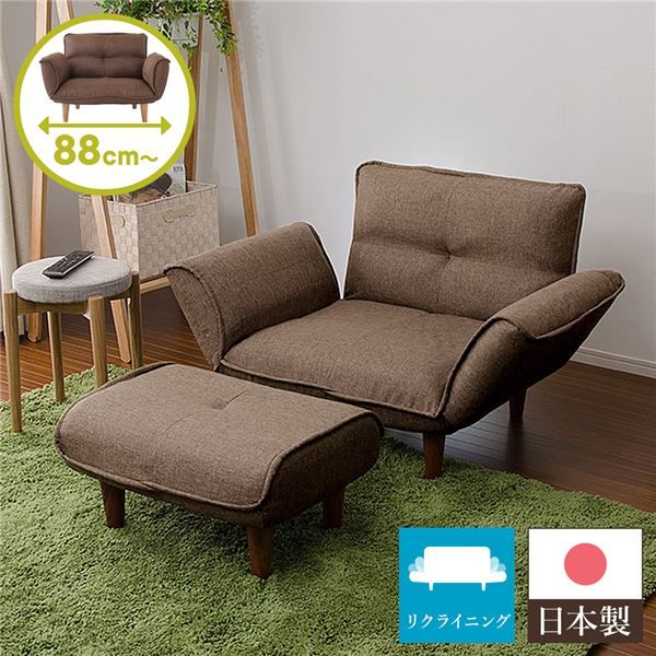 日本製 リクライニングソファー/カウチソファー 1人掛け オットマン付き ブラウン タスク生地 脚部:ブラウン 幅88cm 脚付き 国産 ソファ ソファー おしゃれ ポケットコイル ローソファ 北欧 リビング ひとり暮らし 代引NG