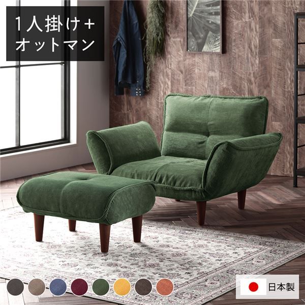 日本製 リクライニングソファー/カウチソファー 1人掛け オットマン付き コールテン生地 グリーン 脚部:ブラウン 幅88cm 国産 ソファ ソファー おしゃれ ポケットコイル ローソファ 北欧 リビング ひとり暮らし 代引NG