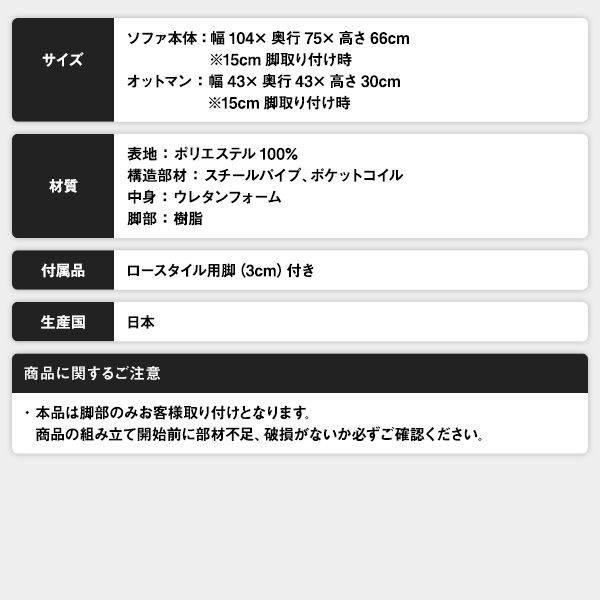 ソファ本体:幅104×奥行75×高さ66cm※15cm脚取り付け時