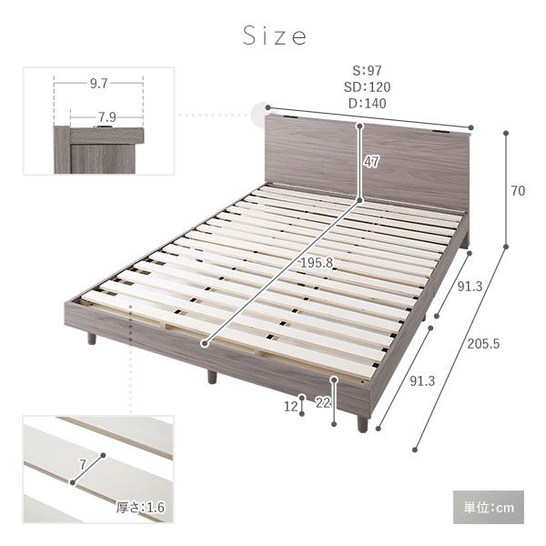 ベッド シングル ボンネルコイルマットレス付 グレージュ すのこ 宮付 棚付 コンセント ロータイプ 頑丈 通気性 すのこベッド ベッドフレーム ローベッド フロアベッド シングルベッド ベット